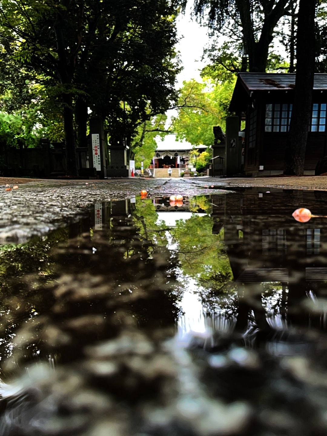 雨上がりの参道を、地面すれすれの低い視点から捉えた一枚。足元に残った水たまりが、小さな水鏡のようにそこにあり、わずかに残る緑の葉と、ぼんやりとした影だけを受け止めています。濡れた石畳の質感や、しっとりとした空気、先ほどまで響いていた雨音が想像できるようです。人の少ない境内の静けさの中、水たまりに落ちた銀杏が、雨とともに訪れた秋の気配をそっと伝えています。