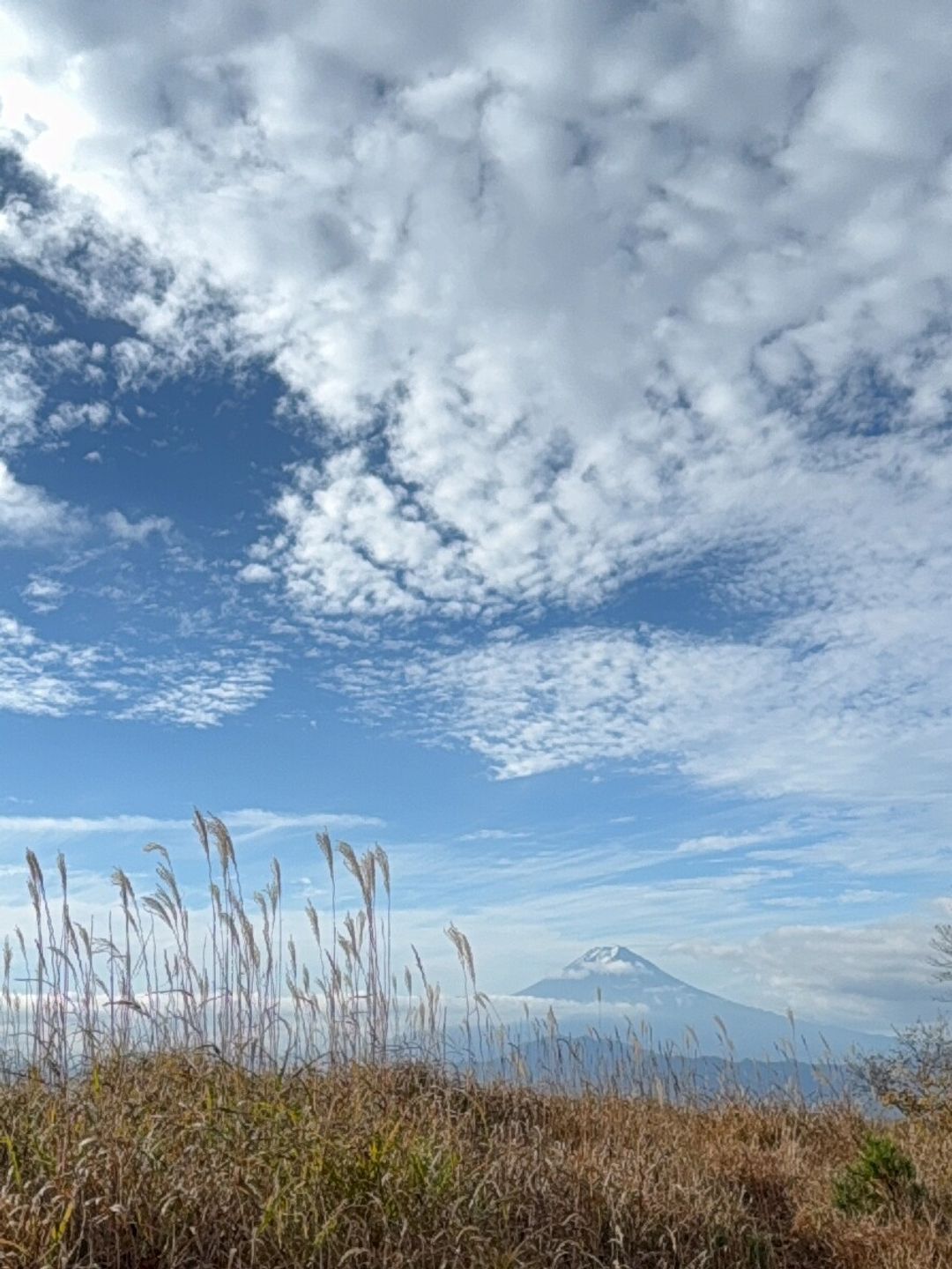 空を主役に据えた構成が、この景色の魅力を引き出しています。鱗雲と揺れるススキの様子から、ほほにあたる穏やかなな風の流れが自然と伝わってくるようです。遠くに控えめに佇む富士山が、空のスケール感を一層際立たせています。色を抑えた全体のトーンが、枯れゆく季節の静けさと呼応し、日本の秋らしい情景とともに、去りゆく季節へ思いを馳せさせてくれるピクティアらしい一枚です。