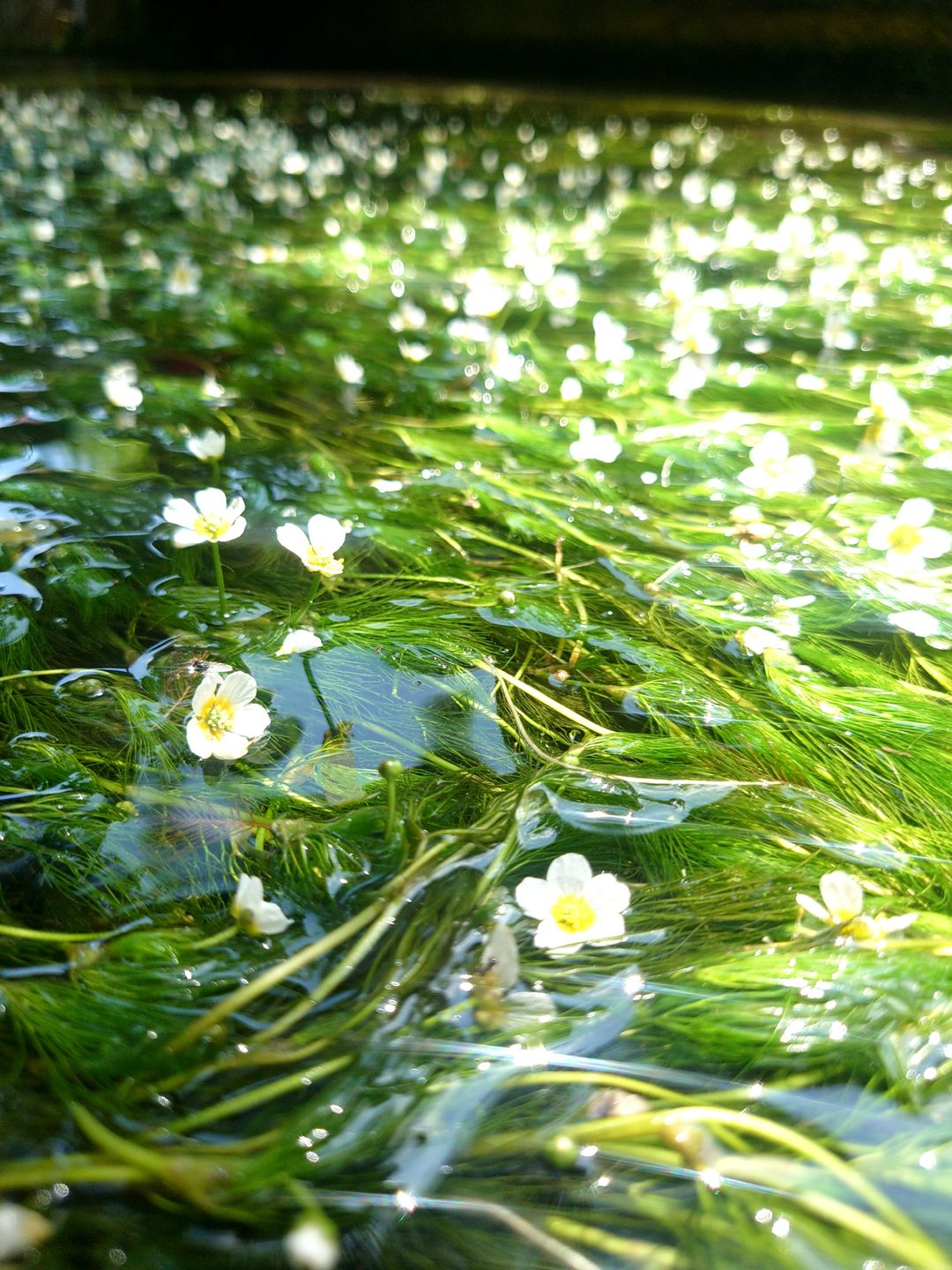 透きとおる川の流れの中に揺れる梅花藻。小さな白い花は水面の光を受けてきらめき、涼やかな水流の中でひっそりと夏を演出しています。耳を澄ませば水のせせらぎが聞こえてくるようで、避暑に来たように涼しげな気持ちにさせてくれます。夏の暑さを少しだけ忘れさせてくれるような、豊かな自然の風景です。