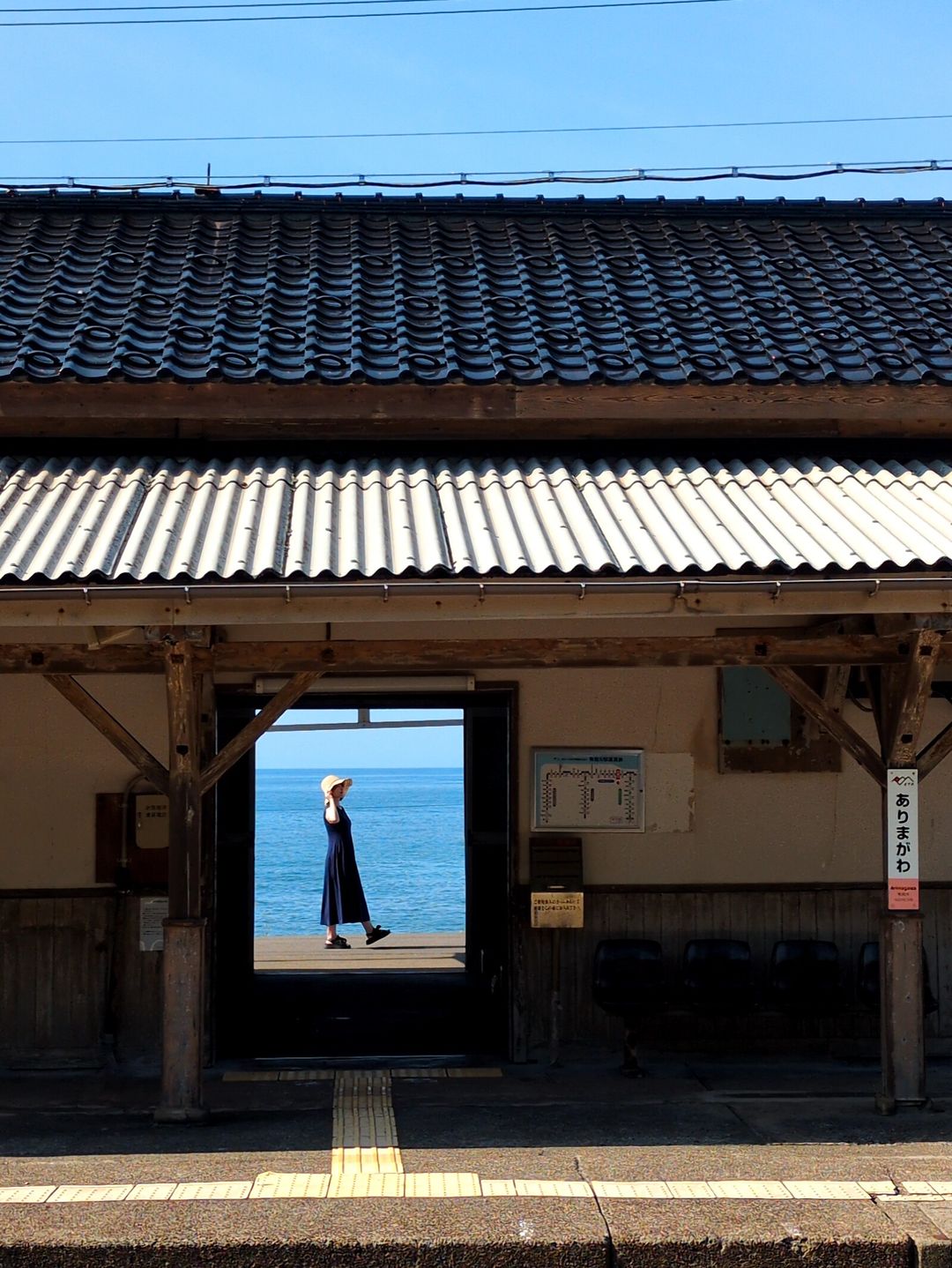 駅舎の出入り口から見える、真っ青な海。まるで額縁の中に夏の一瞬が美しく切り取られているようです。ノスタルジックな駅舎越しに見える、外の眩しい光景は、日常の延長にありながらもどこか非日常的で、これから目の前に広がる美しい夏がそこにあることを期待させてくれる、心が弾む風景です。